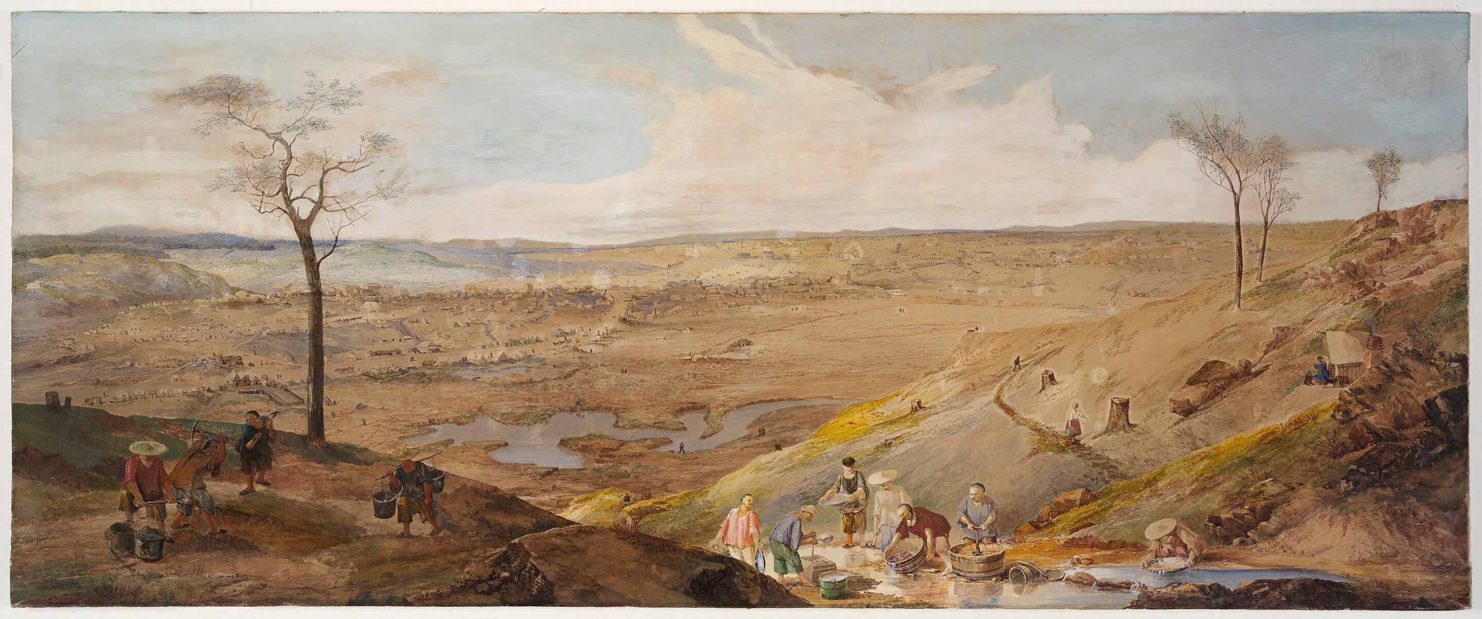 广东受惠于清朝“一口通商”的政策,从18世纪起就成为一次鸦片战争前中国唯一的对外通商口岸,除了货物贸易的流通,亦带来了信息的快速流通。当大洋彼岸的澳洲发现黄金时,消息迅速传到了窘迫的农民耳中。于是,众多的中国人,特别是四邑、中山等广东农民准备去到“新金山”澳大利亚碰碰运气,1855年,维多利亚州的中国淘金客达到了惊人的一万九千人规模。3
