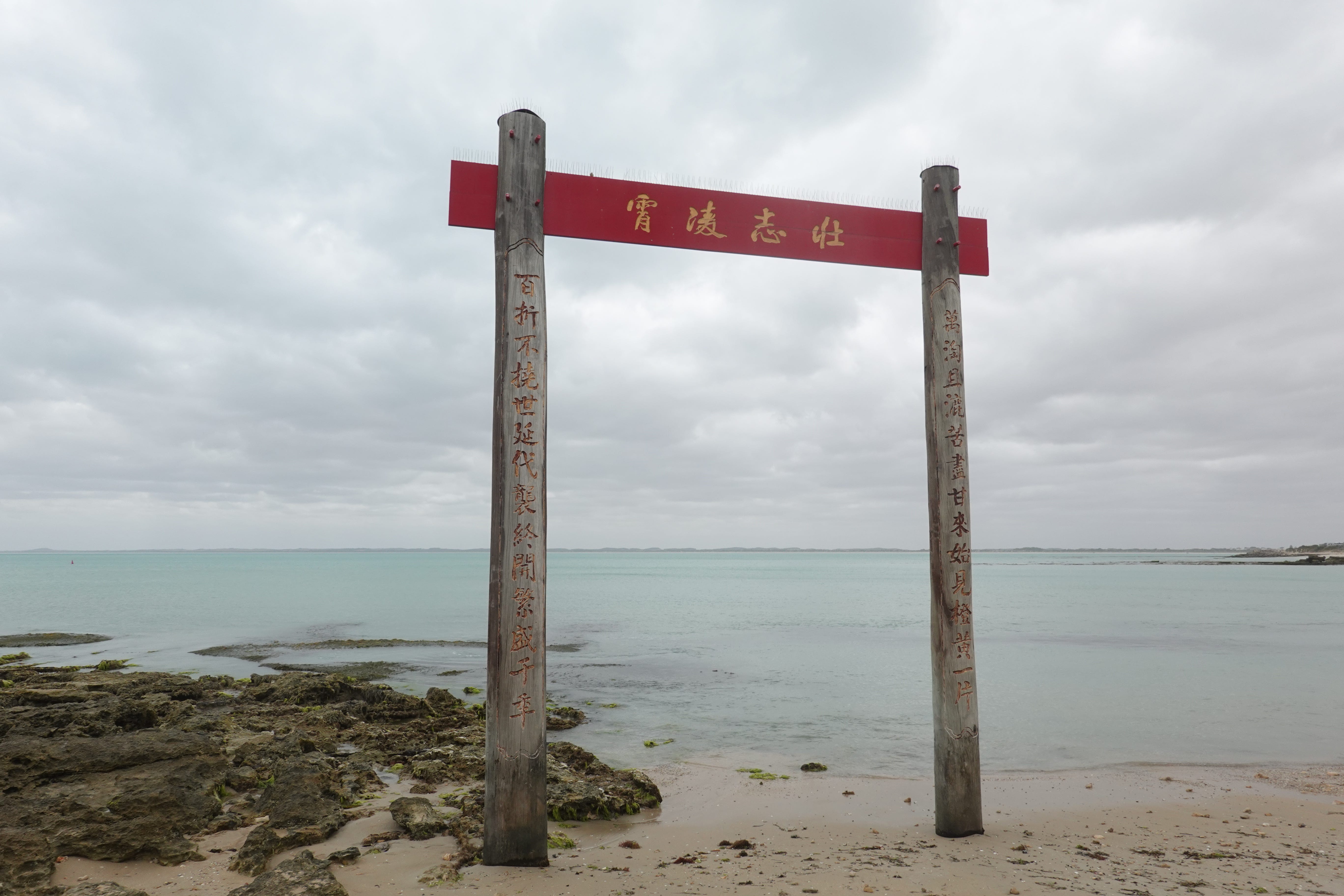 一个多小时的车程后,便抵达了Guichen湾南部的Robe,从外表来看和其他澳洲沿海小镇没有任何分别,时间正值中午,在炸鱼薯条店买了一份fish&chips,开车到海边的停车场享用午餐,许久都没有吃炸鱼薯条,这次品尝到本地捕捞的Gummy shark做成的Flake香脆多汁。眼前的海边的人们在散步、孩子们在草坪上玩耍,一切如常,风平浪静。然而沿着海滨向西再走上几百米,沙滩和黝黑的岩石间耸立着一座简陋如鸟居一般的中式牌坊,牌坊的木板上雕刻着一幅中文对联: