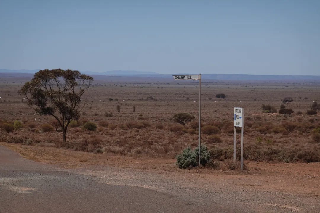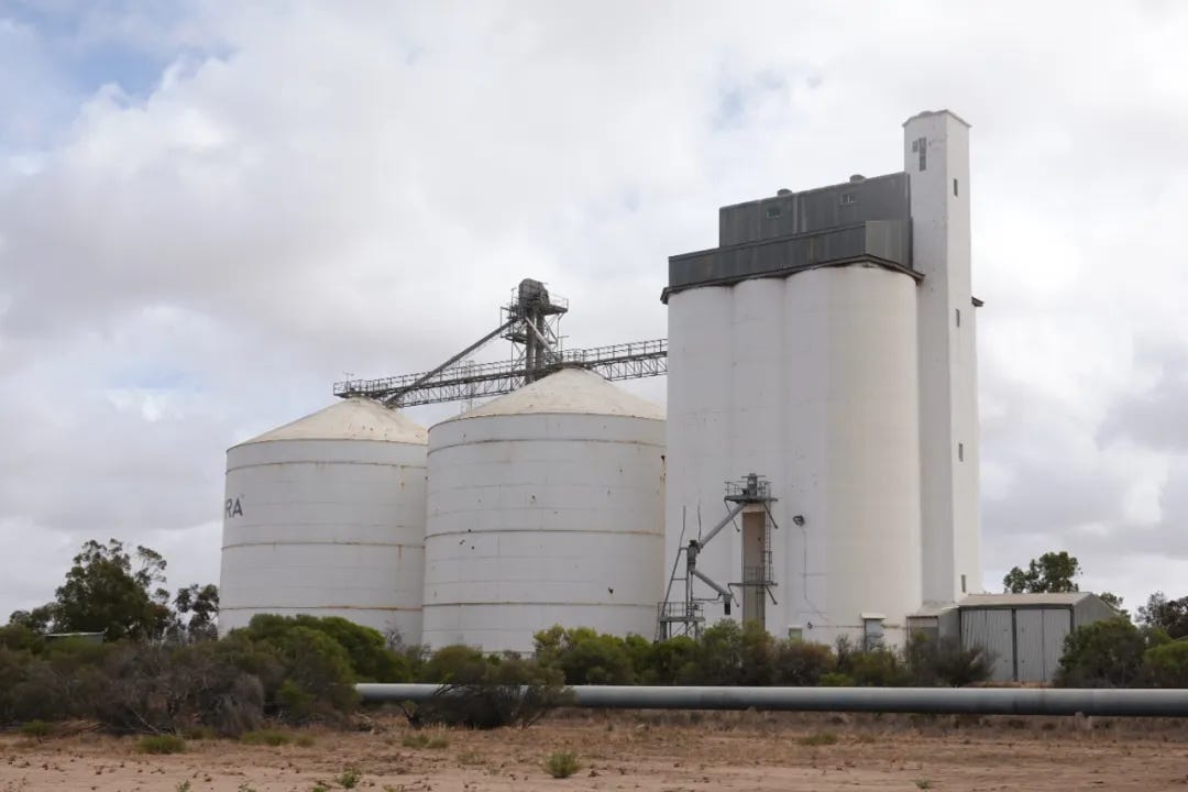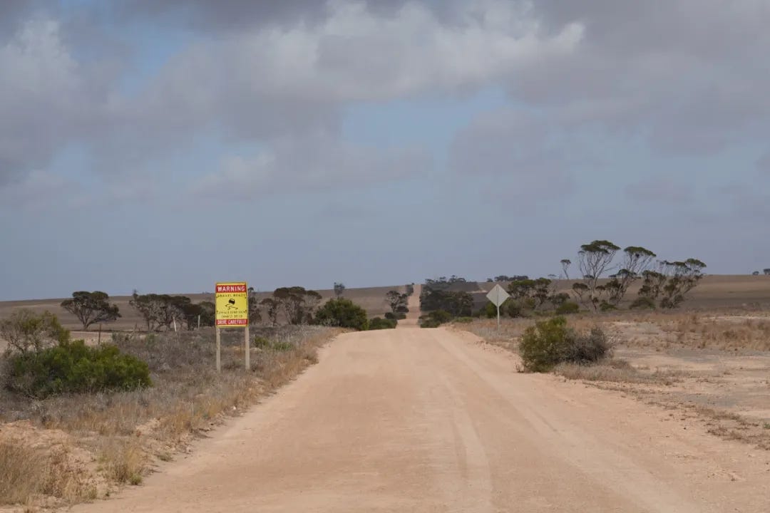 沿着艾尔高速公路(Eyre Hwy)继续西行,穿过长满低矮灌木的隔壁荒原,景致倒是和昆士兰内陆的Mount Isa附近有很多相似,一百公里后,两旁的景致由渐渐变成了金黄色的农场,这便抵达了艾尔半岛北部的农业区。这里是澳洲最早开垦的地区之一,早在19世纪中叶,由欧洲而来的殖民者便开始开垦艾尔半岛的土地,1846年英国的谷物法(Corn Laws)废除后,澳洲的农产品可以更自由地进入英国市场,这进一步加速了包括艾尔半岛北部地区的开墾。