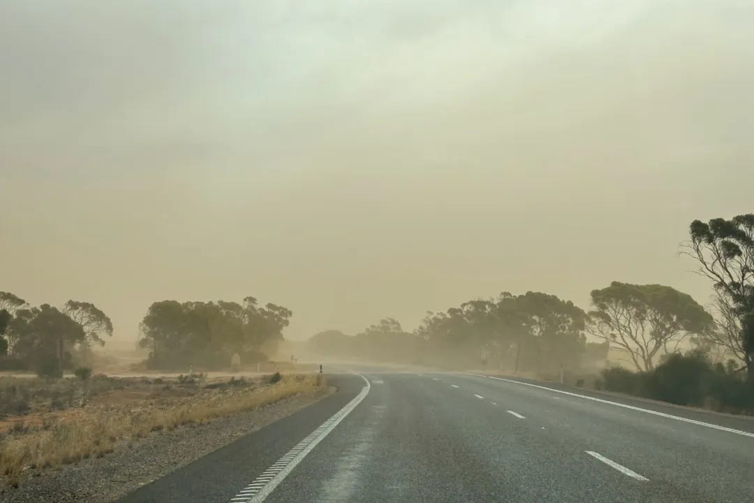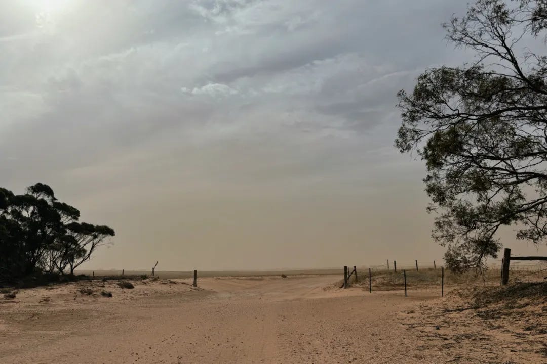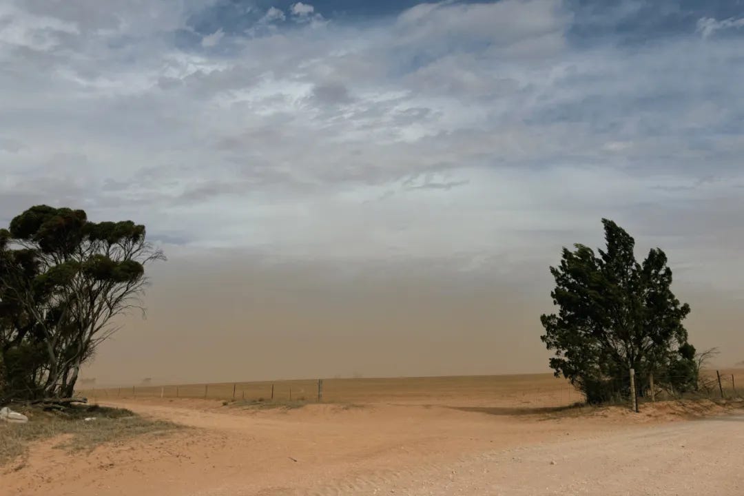 开车继续前行,天空逐渐由先前的澄澈渐渐变黄,狂风席卷着沙尘漫天飞舞如沙尘暴般,起初我还以为是来自澳洲内陆戈壁的沙尘,但仔细一看,沙尘竟来自两旁的农田。荒漠化(Desertification)后的农田已经很难看出曾经农田的样子,只有公路之间的栅栏显示着这里曾经是丰饶的农场。先前我只在地理教科书中读过“荒漠化”,还是第一次肉眼所见这一切的恐怖,开车数十公里,荒漠化农田所产生的沙尘暴如影随形,即可想见规模是有多么的庞大。2月的澳洲正是盛夏的季节,但农田中空无一物,为沙砾和碎石块所占据。