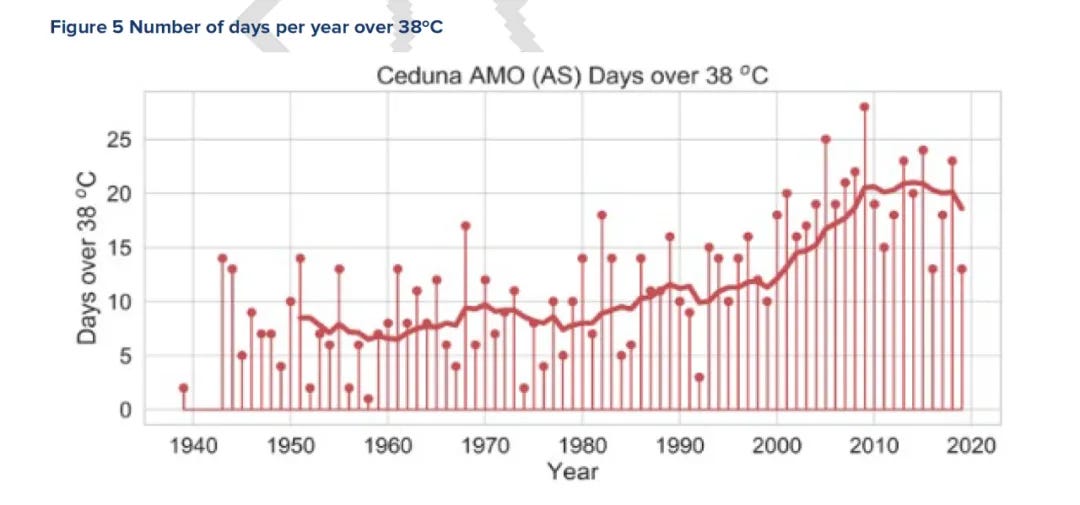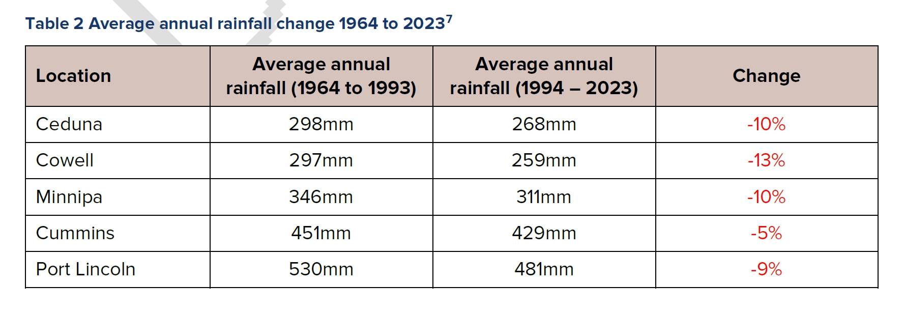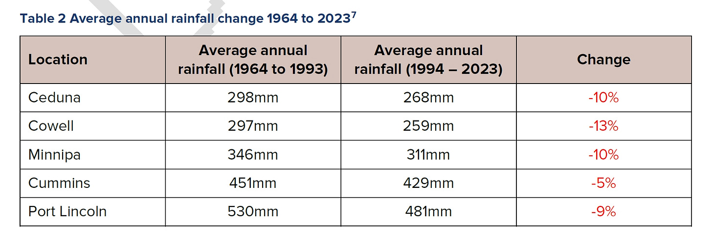 直到十九世纪八十年代的大干旱来临,农民们才意识到先前理念的错误,此前农民们都谈论着在北领地边界(Northern Territory,南纬 26 度)种植谷物作物。然而,如今谷物作物仍然无法在比Quorn(南纬 32 度附近)更北的地方生长。即便是能够生长的地区,干旱的阴影也如影随形,从而形成了造成荒漠化的恶性循环:干旱导致农作物的歉收、农田造成的低生物多样性导致了水土保持变差,导致表层土地被咆哮西风带(Roaring Forties)的大风冲刷,降低土地肥力、长期干旱和低产量迫使部分农民放弃农场,迁移到其他地区。近年来的全球变暖更是在这片本已脆弱的地区造成显著影响,例如降水量减低以及极端高温天数增加等。