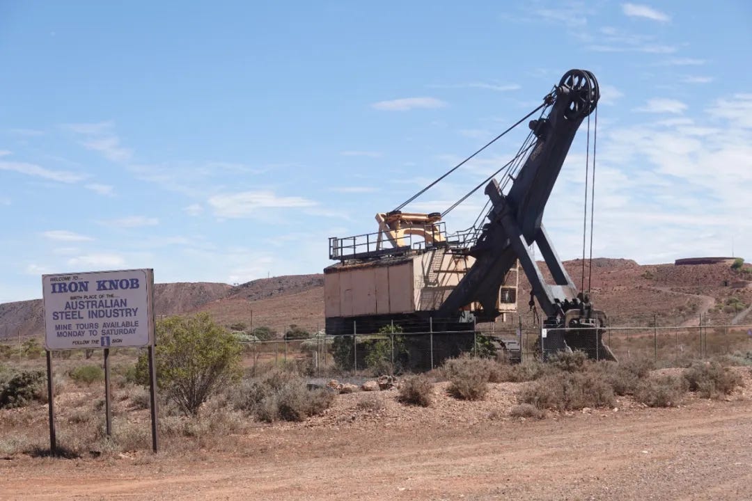 Knob于英文中有“门把手、旋钮”的意思,相较于其在平原隆起的外貌,这个名字可谓恰当非常。甫一进入城镇,眼前就是台巨大的挖掘机,眼前的牌子上写着“Birth place of the Australian Steel Industry”,即“澳大利亚钢铁工业诞生之地”。这令人甚至感到有些傲慢的自夸,与眼前凋敝的城镇极为不相称,一查Wikipedia才晓得,Iron Knob这里的铁矿石纯度极高,达到了惊人的60%,其于1900年即开始开采铁矿,起初使用牛车、随后升级成为电车(BHP Whyalla Tramway)和铁路将矿石运往临近的Whyalla港,由此再运送至Port Pirie、Wollongong和New Castle等地的冶炼厂。
