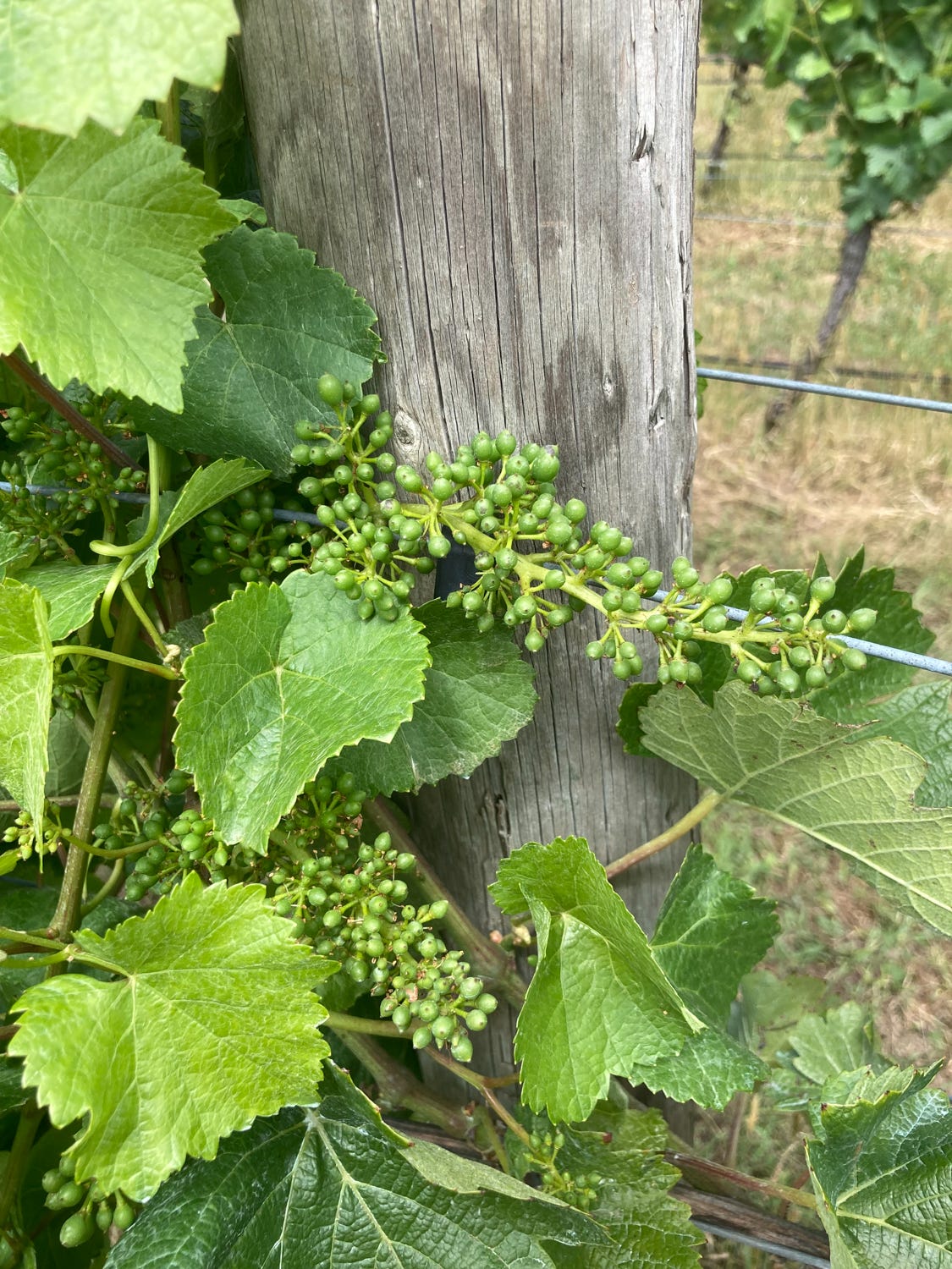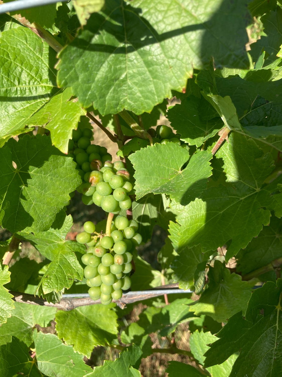 随着时间一周周得度过,葡萄花渐渐凋谢,原来的柱头上长出了青绿色的葡萄浆果,起初只有一颗绿豆的大小,渐渐长成黄豆、鹰嘴豆的大小。农场中干活,才感受到了中国古话中农业的“靠天吃饭”,去年年末的夏季雨水比往常多很多,有一天甚至还下起了有黄豆大小的冰雹,人在屋子里面呆着,外面下雨和下冰雹倒是没什么差别,但是对于葡萄这样的浆果,简直是枪林弹雨。第二天上班时,葡萄叶表面遍体鳞伤,约10%的浆果被冰雹击破表皮而渐渐腐烂。靠天吃饭也不仅仅对于农业,更对于我这样计时给薪的Casual,只要下雨,便不能工作,也就没有钱。